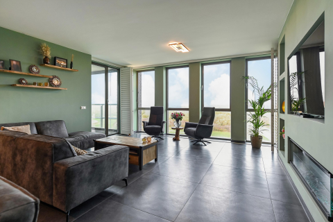 De woonkamer bevindt zich aan de tuinzijde van de woning en heeft een oppervlakte van circa 28m². De woonkamer (en keuken) heeft grote raampartijen, en is geheel voorzien van stucwerk, een verlaagd plafond met inbouw verlichting, een cinewand en een visgraat PVC vloer met vloerverwarming, welke doorloopt naar de keuken.